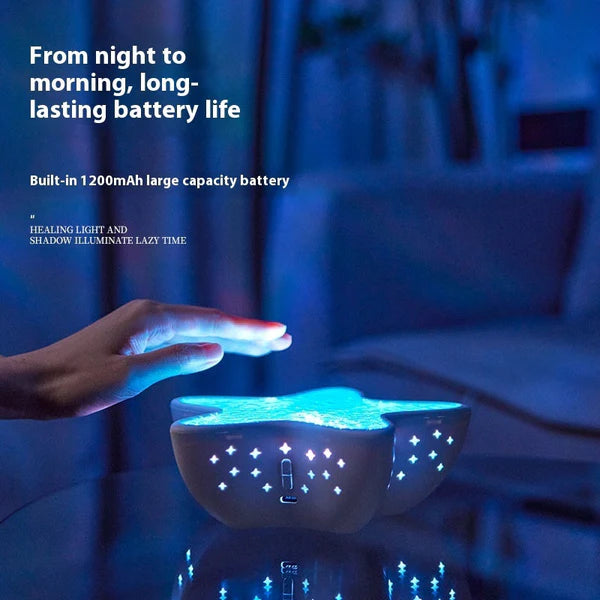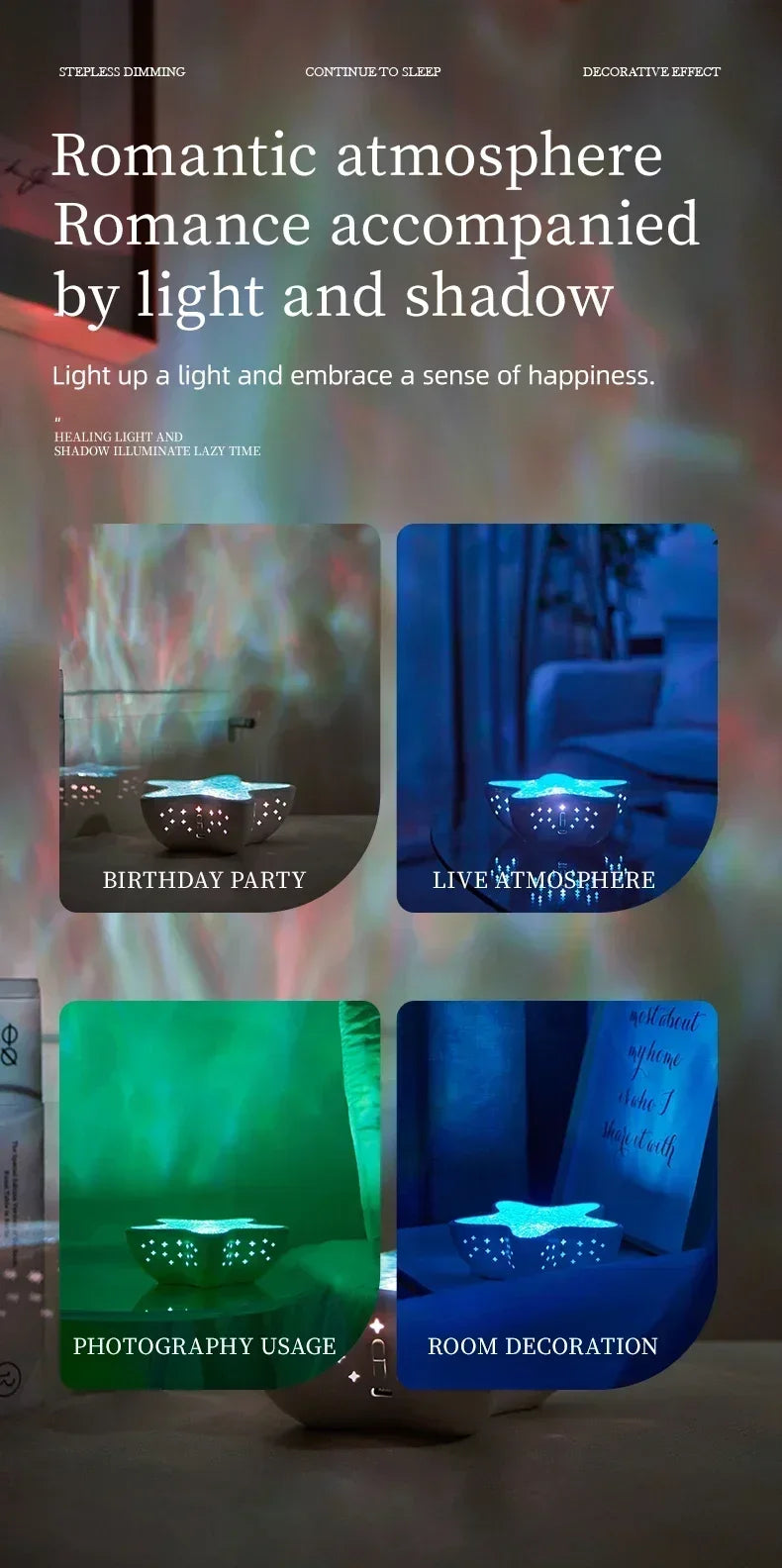 Transform your bedroom, living room, or nursery into a peaceful, underwater sanctuary with mesmerizing starry patterns and soft ambient light. This soothing lamp projects glowing starfish and oceanic designs across your walls and ceiling, wrapping your room in a wave of tranquility.